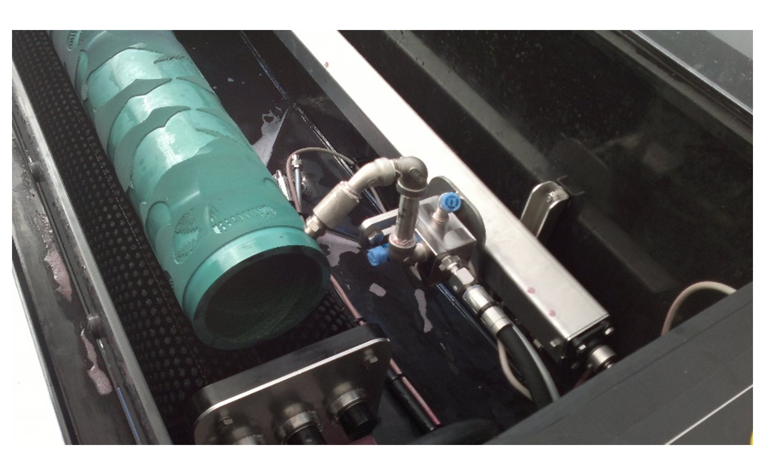 The process consists of placing them into a heated tank containing the cleaning solution and is slowly rotated. This exposes all surfaces of the roll to the action created by ultrasonic transducers in the bottom of the tank. The combination of heat, chemicals and the imploding bubbles, effectively lift the dried ink off the roll.
