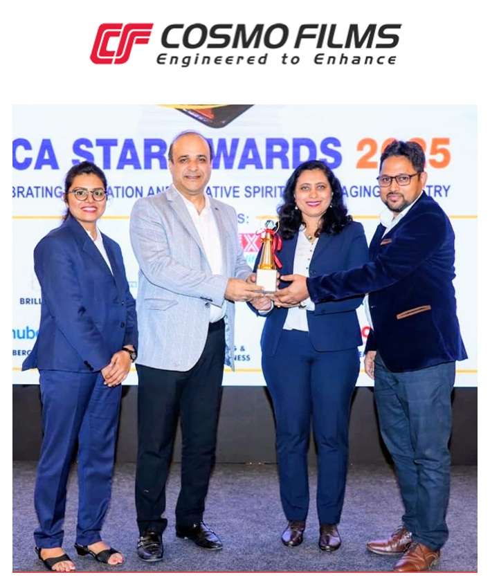 Cosmo Films, the Film manufacturing Business Unit of Cosmo First, has been recognised with the prestigious Indian Flexible Packaging and Folding Carton Association (IFCA) Star Award 2025 for its innovative packaging solutions – High Heat Seal Strength Metallized Barrier BOPP Film (HST-1 (ES EL)MOT085) and CPP-based Retortable Sealable Peelable Lidding Film (HST-1 (LRT)CPP). The innovations address the growing need for high-performance, eco-conscious packaging solutions across the FMCG and food sectors.